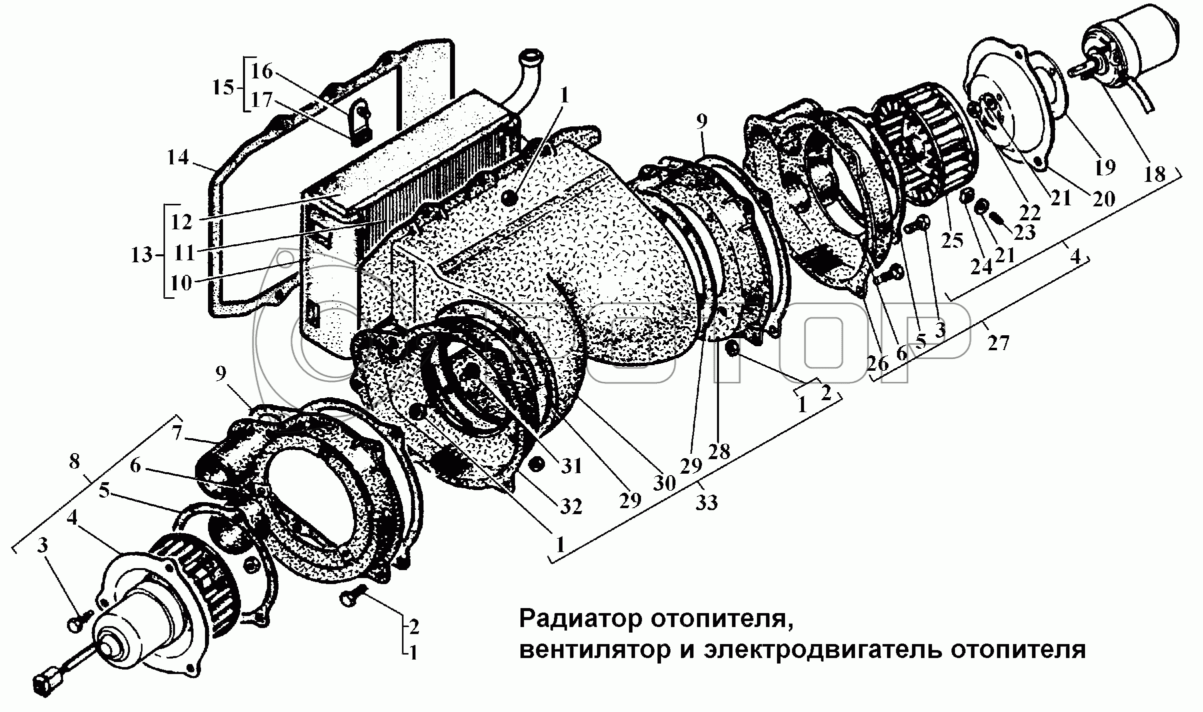 Каталог запасных частей к технике: ГАЗ-3308. Радиатор отопителя, вентилятор и электродвигатель отопителя